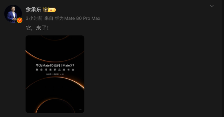 华为官方于11月17日宣布,将于11月25日举行“华为Mate80系列、MateX7及全场景新品发布会”。随后大旗策略,华为常务董事、终端BG董事长余承东在社交媒体上首次展示了Mate80ProMax真机外观,其微博小尾巴也确认了“华为Mate80ProMax”的命名。
